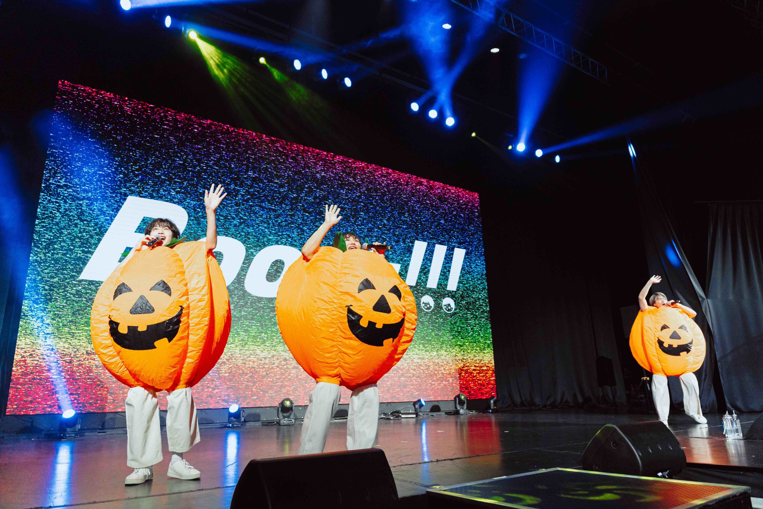 さっそく3人が登場……と思いきや、ハロウィンカボチャ姿で登場!動くたびにぽよぽよしたカボチャ姿でメドレーを歌って踊って、本当に見ていて飽きないし可愛すぎる。ライブでありながら、パーティみたいに楽しい雰囲気にさせてくれました。